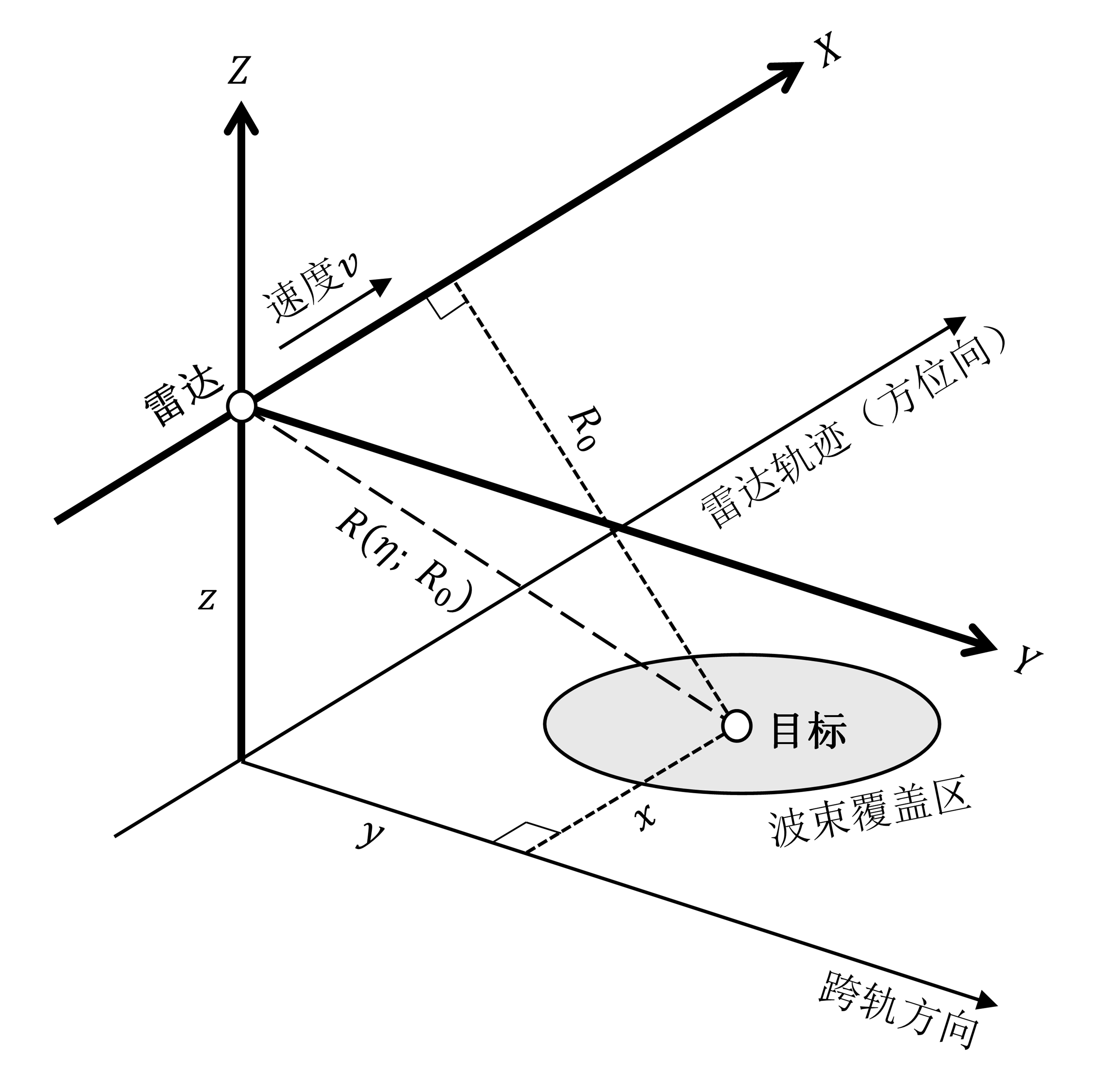 下图给出了SAR成像的几何模型。雷达沿直线匀速飞行,其速度为 v v v,飞行高度为 z z z。以雷达中心为原点,飞行方向为X方向,跨轨迹方向为Y轴,竖直方向为Z轴,建立空间直角坐标系。波束覆盖区中一点目标的坐标为 ( x , y , − z ) (x, y, -z) (x,y,−z), R 0 R_0 R0为目标到飞行轨迹的垂直斜距, R ( η ; R 0 ) R(\eta; R_0) R(η;R0)为目标到雷达的瞬时斜距。 η \eta η表示方位向时间(慢时间), τ \tau τ表示距离向时间(快时间)。瞬时斜距可以表示为: