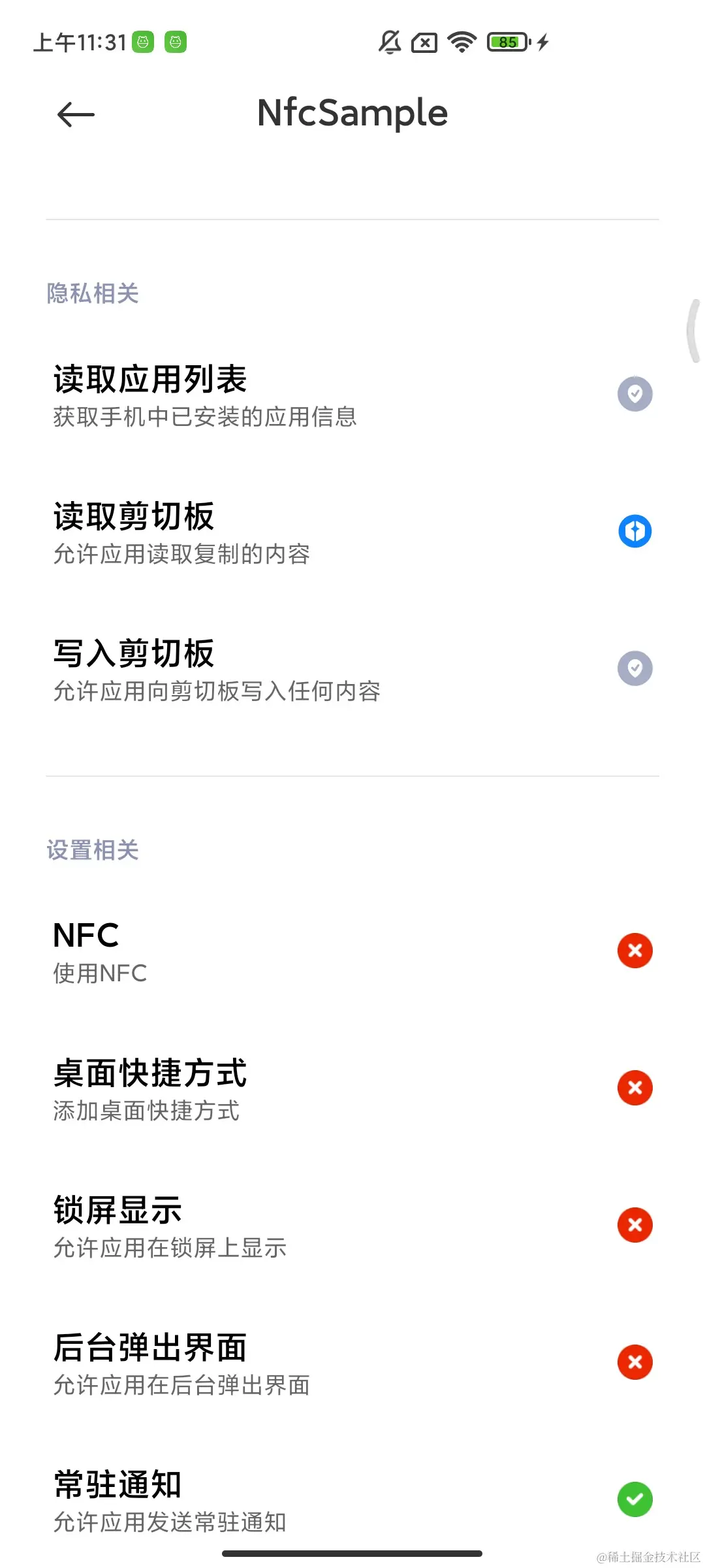 然而,对于深度定制系统(如MIUI、HyperOS)而言,这一规则只是基础。MIUI将Android定义的"正常权限"或未明确界定的操作,纳入了自己的权限管理体系。其中最具代表性的便是NFC权限 和剪切板权限。