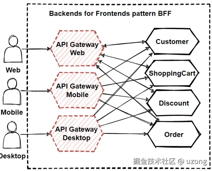 单一的复杂 API 网关可能存在风险,并可能成为我们架构中的瓶颈。大型系统通常会通过按功能类型分组客户端来暴露多个 API 网关,例如移动端、Web 端和桌面端。当避免为多个接口定制单一后端时,BFF 模式非常有用。