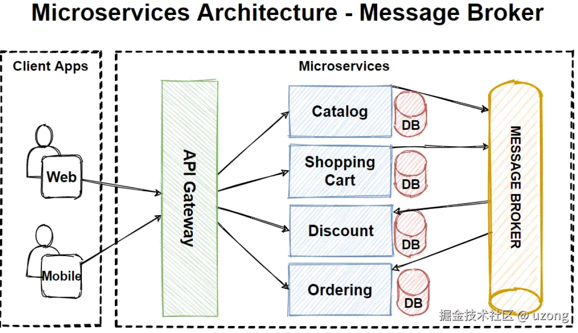 我们在微服务架构中创建了 API 网关。所有这些同步请求都来自客户端,并通过 API 网关发送到内部微服务。