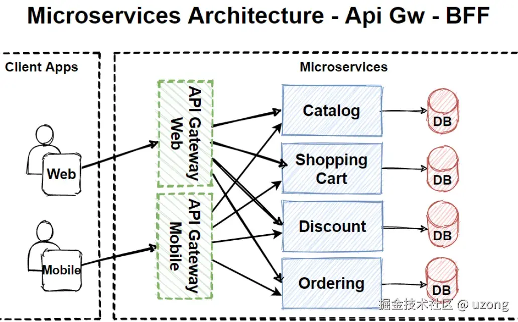 面向前端的后端(Backends for Frontends pattern BFF)模式可以根据特定的前端应用程序分离 API 网关。因此,我们拥有多个被前端应用程序消费的后端服务,而在它们之间,我们包含 API 网关来处理、路由和聚合操作。