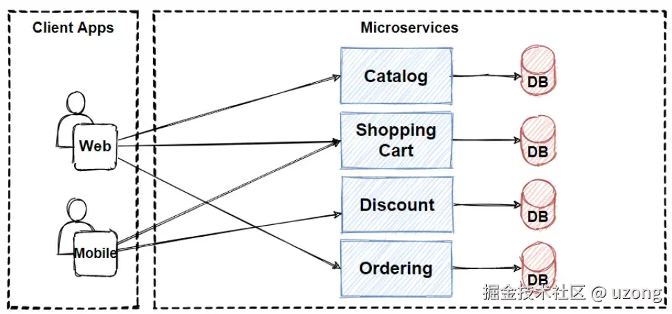 让我们看看微服务架构图,思考这个架构中缺失了什么?这个架构的痛点在哪里?我们如何将这个架构演进成更优的架构,使其更具可扩展性、可用性,并能够处理更多并发请求