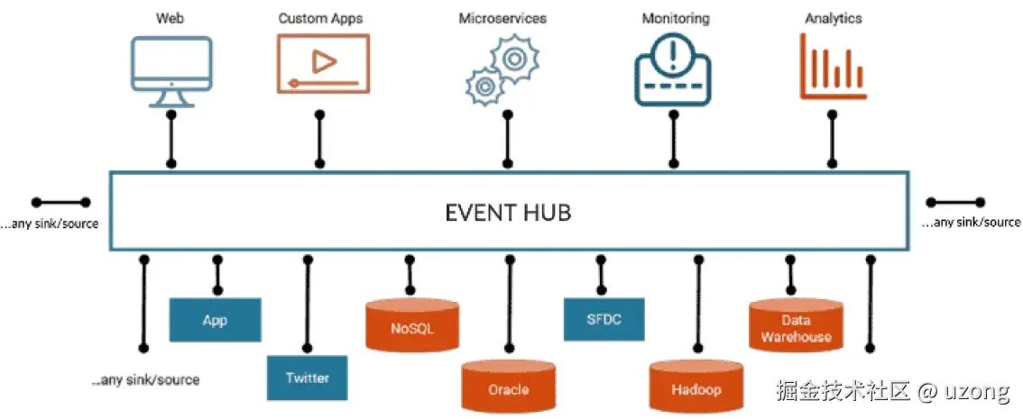 根据这种新的事件驱动微服务架构,我们可以通过 Event-Hubs 连接所有内容。我们可以将 Event-Hubs 视为一个可以提供实时处理的大型事件存储数据库