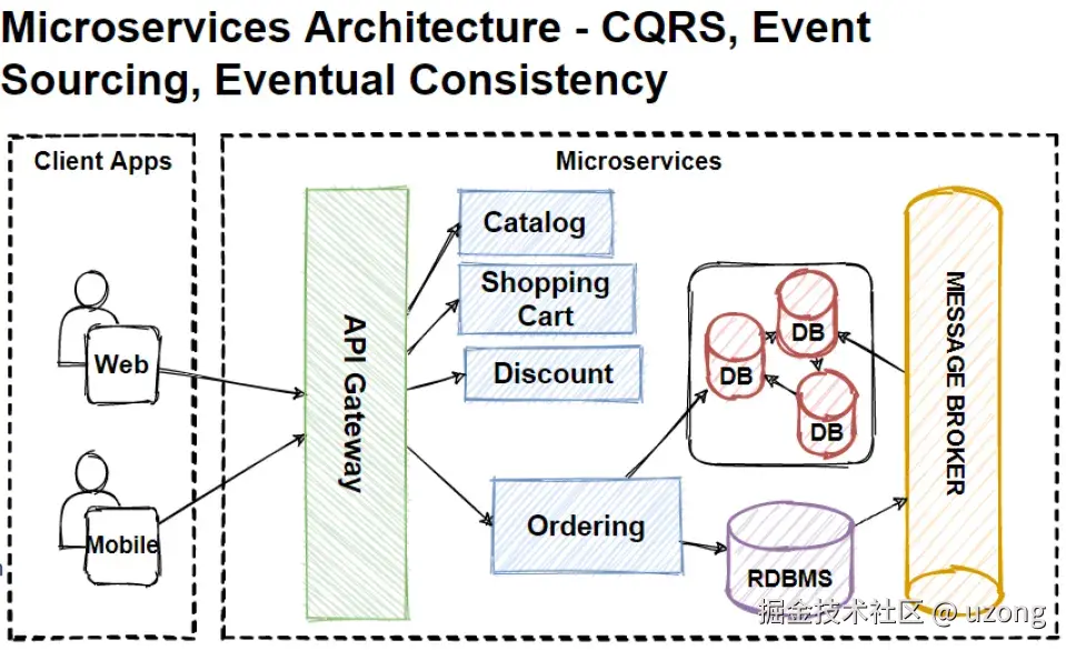 CQRS 是微服务间查询时的一种关键模式 。我们可以使用 CQRS 设计模式来避免复杂的查询并消除低效的连接。CQRS 代表命令和查询责任分离。这种模式将数据库的读和写操作分开