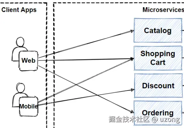 可以看到前端 UI 元素和微服务之间的通信是直接的,管理所有这些连接点似乎很复杂。现在我们应该专注于微服务之间的通信