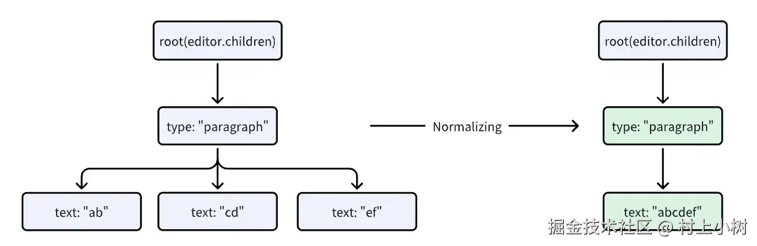 值得一提的是Normalizing 阶段中不会对SlateNode树中的每个Node进行检查。他只会对在交互过程中,被标记的Node进行检测(注意:新生成的SlateNode不一定会被标记)。slate.js内部会有一套巧妙的标记逻辑去过滤出有必要的Node去检查,从而减少Normalizing阶段的耗时。