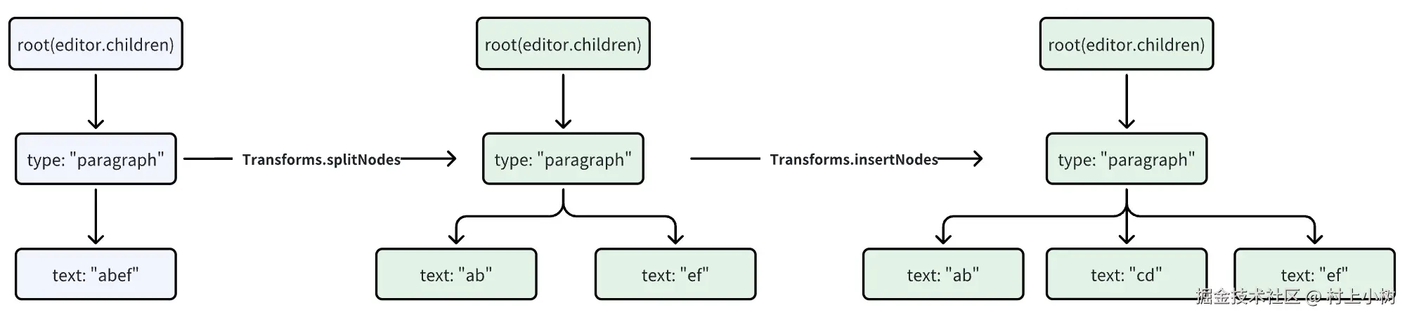 js[ { type: "paragraph", children: [ {text: "ab"}, {text: "cd"}, // 插入的新的SlateNode {text: "ef"} ] }, ] -