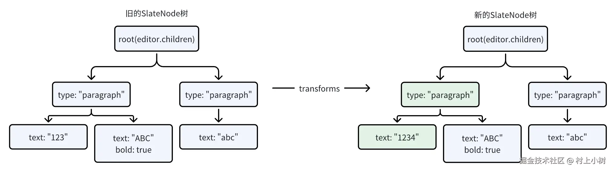 相当于把第一个type为"paragraph"的SlateNode给替换了,如下👇图所示,右侧新的SlateNode树中,绿色背景方块代表新生成的SlateNode,而蓝色方块代表复用的SlateNode。