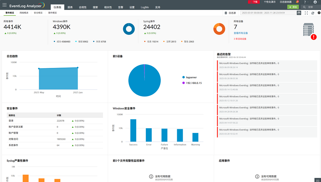 EventLog Analyzer 是 ManageEngine 推出的综合日志管理解决方案,能够帮助企业高效收集、分析和管理来自不同来源的日志数据。它能够整合分散的日志信息,帮助管理员从海量数据中提取有价值的安全洞察。