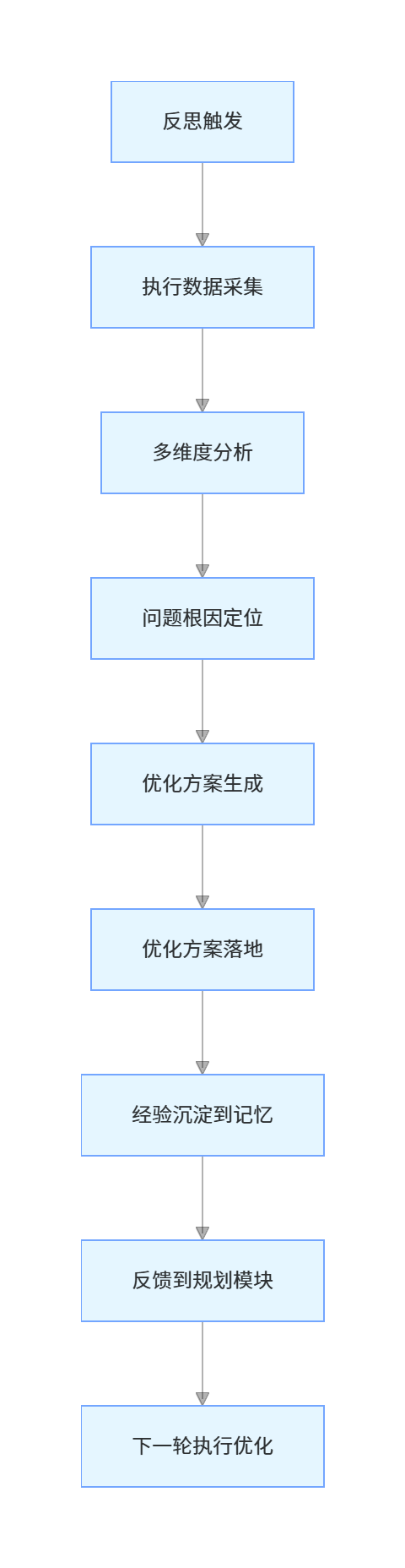 每一步动作执行完成后,反思模块会根据执行结果,判断是否需要触发单步反思,分析执行过程中的问题,生成优化方案,沉淀经验到记忆模块,同时反馈给规划模块,优化后续的执行计划。