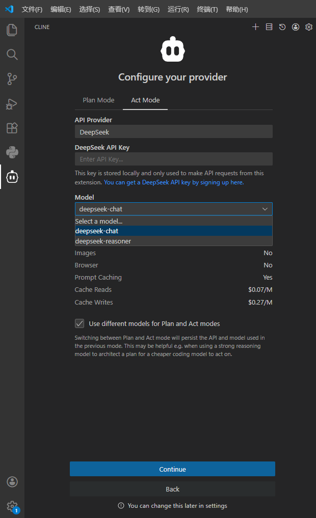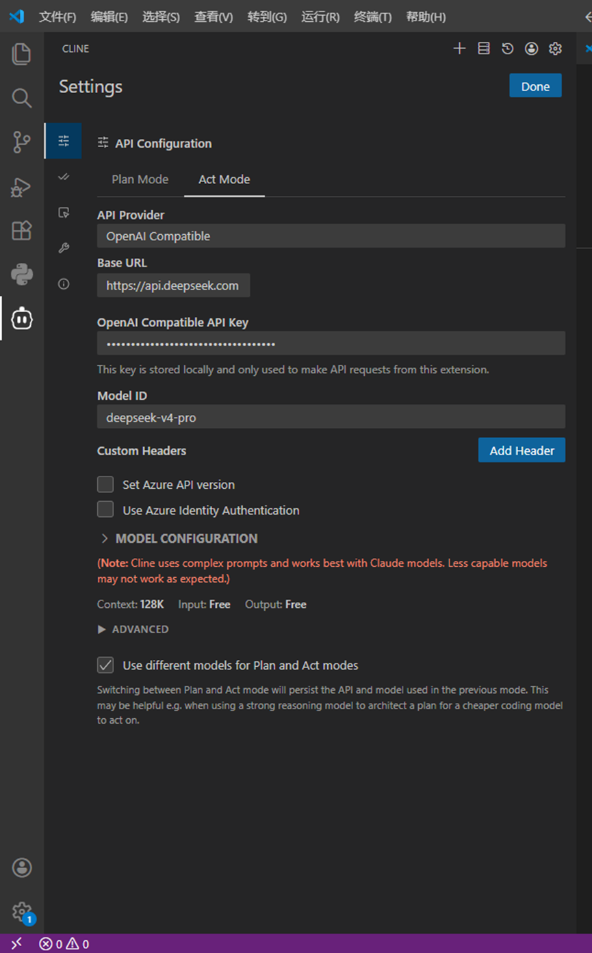 勾选后:你可以为"Plan"和"Act"分别选择不同模型。例如,用昂贵的旗舰模型(如 deepseek-v4-pro)做代码生成,用便宜快速的模型(如 deepseek-v4-flash)做规划,在确保任务质量的同时有效控制成本。