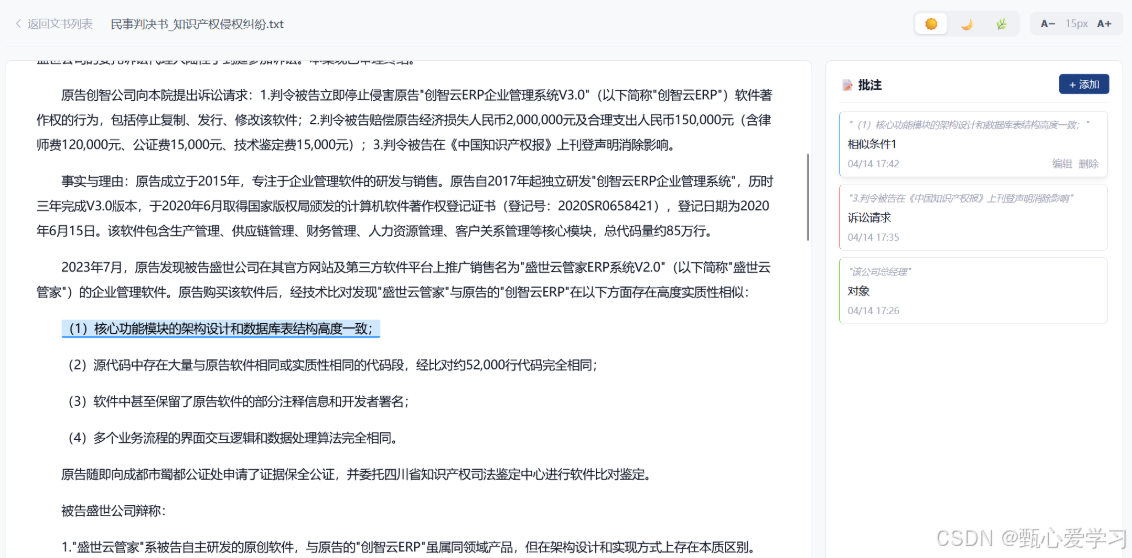 <mark>高亮;右侧批注面板集成 Tiptap 编辑器,支持富文本格式;实现了批注与原文的双向联动滚动与高亮激活。