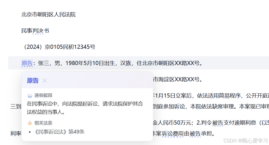 - 悬浮词典: 采用本地词库预加载 + 后端异步更新双轨机制。前端通过正则扫描高亮法律术语,点击后弹出浮动卡片显示解释与法条。实现了事件委托以优化性能。