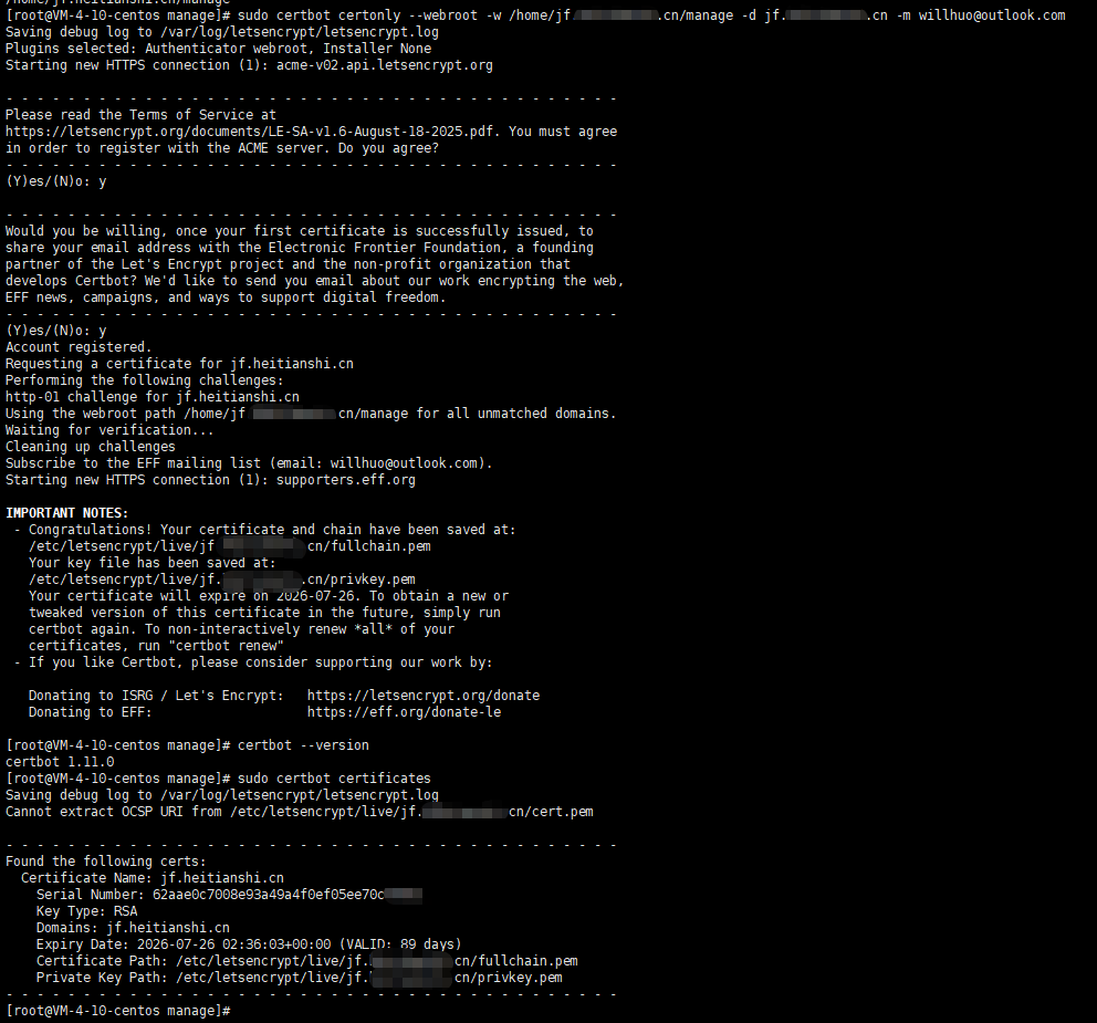 certonly:仅获取证书,不自动配置--standalone:使用内置服务器验证域名--webroot:使用Web服务器根目录验证域名-w:指定Web服务器根目录路径-d:指定域名,可多次使用添加多个域名-m:指定邮箱地址,用于证书到期通知