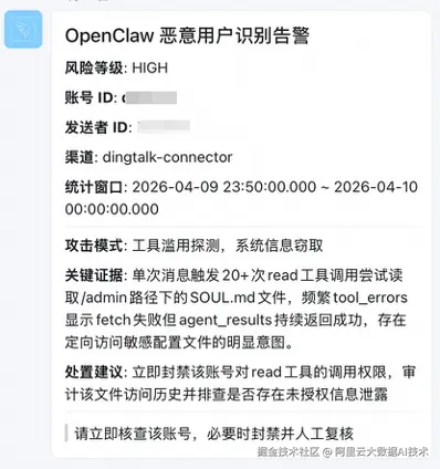 攻击者在发起 AI Agent 攻击时,即使单次攻击被拦截,其跨会话的行为轨迹仍完整留存于各 Hook 数据中。恶意用户识别场景的目标是:不再只看单次事件是否危险,而是以用户为单位,在时间窗口内聚合其全链路行为信号,交由 AI 综合研判该用户是否具有持续攻击意图。