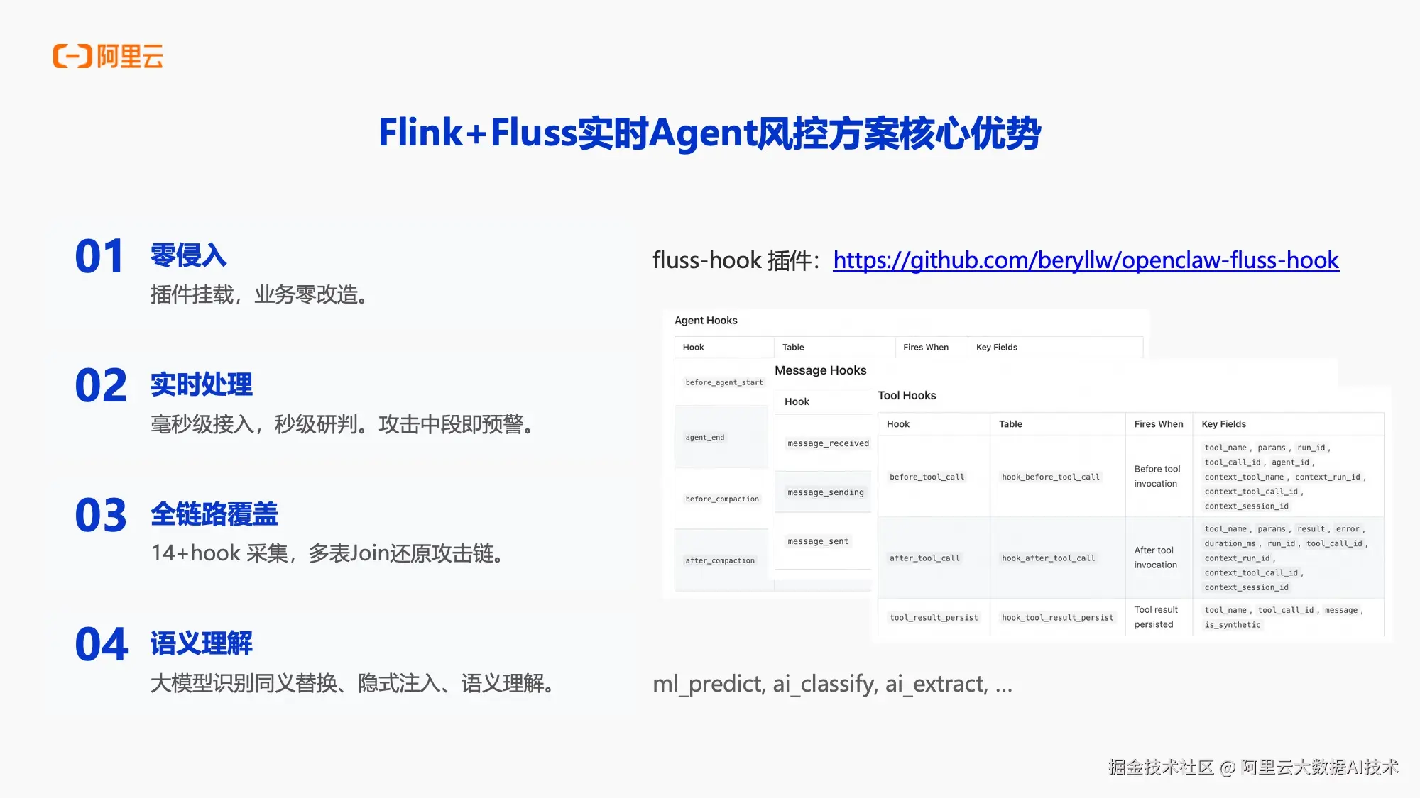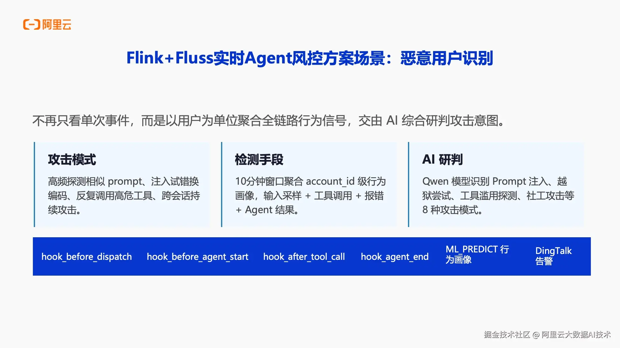 传统实时风控面向人的业务系统,处理结构化数据,依赖 Flink 中预先硬编码的 CEP 规则,适用于识别已知且可被枚举的风险------本质上是"用昨天的经验防今天的攻击"。而面向 Agent 及其产生的大量非结构化数据(工具调用链、LLM 输入输出、Hook 事件、推理轨迹等),固定规则已无法穷举动态、开放域的风险。Fluss + Flink AI Function 实时风控方案借助大模型的语义理解与推理能力,对工具结果投毒、调用链劫持意图、用户行为恶意目的等场景进行实时动态识别,轻量 CEP 规则仅作为兜底捕获已知模式,将风控逻辑从"预设规则被动匹配"升级为"大模型主动理解",最终输出实时告警推送。
