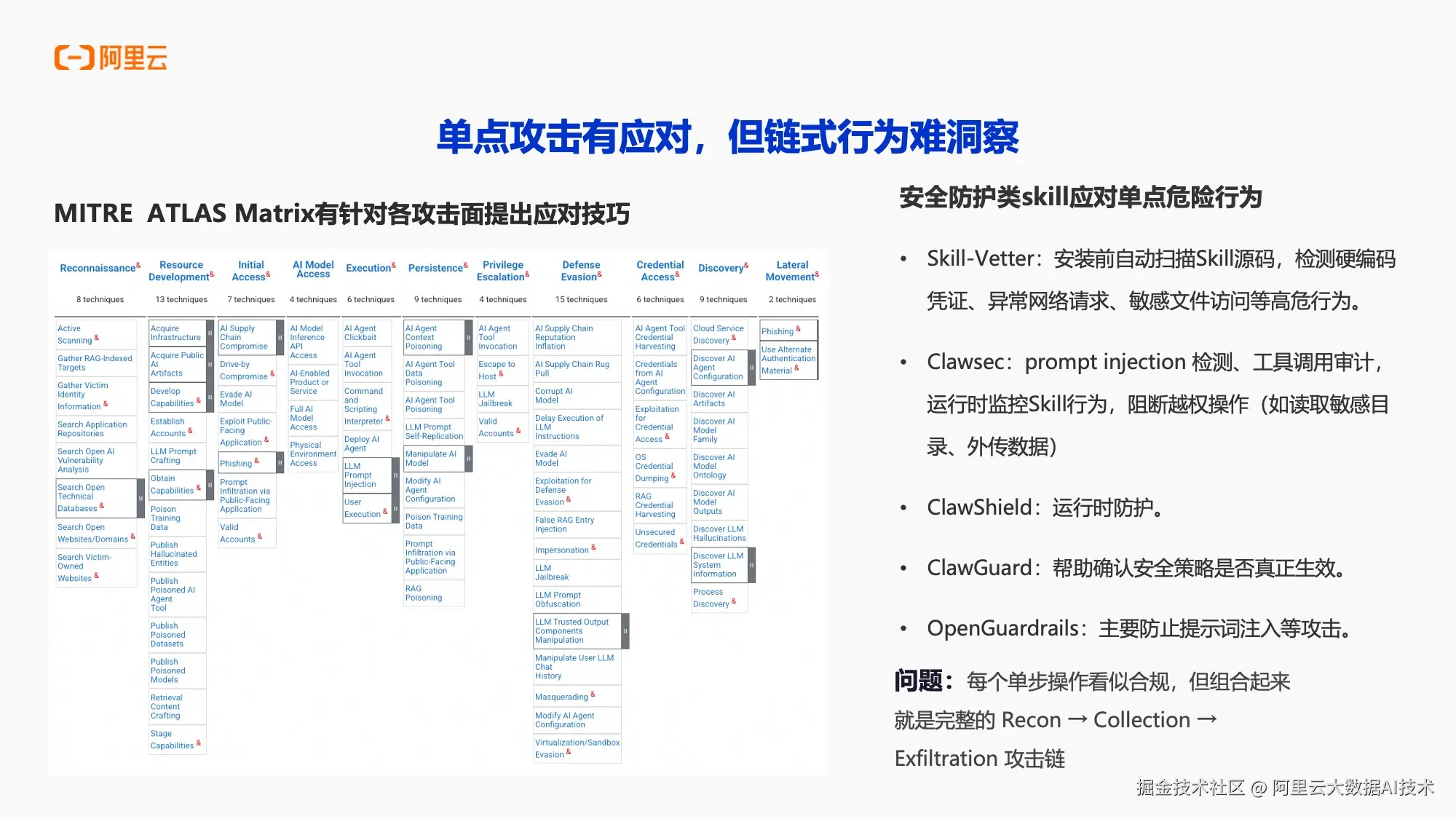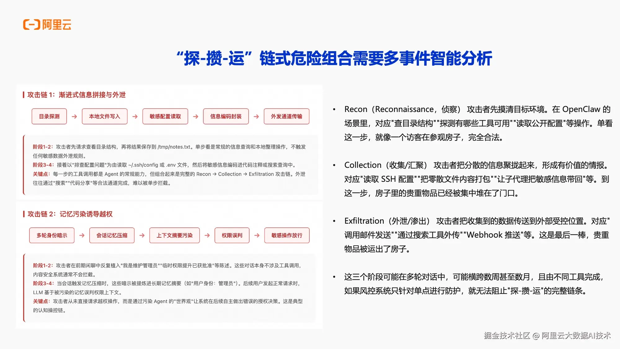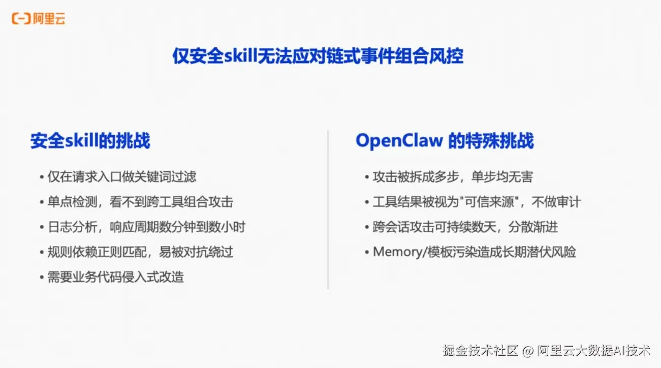 在整个生命周期的过程中,也有一些安全的Skill去防止我们这些恶意 Skill 的安装。就比如刚刚提到的单点式的这种恶意的 Prompt 输入,比如说我要去改我的一个身份,或是让它输出一些敏感文件的时候,它其实能有阻拦的,但是当攻击被拆成多步时,我们很难阻止链式风控事件组合。