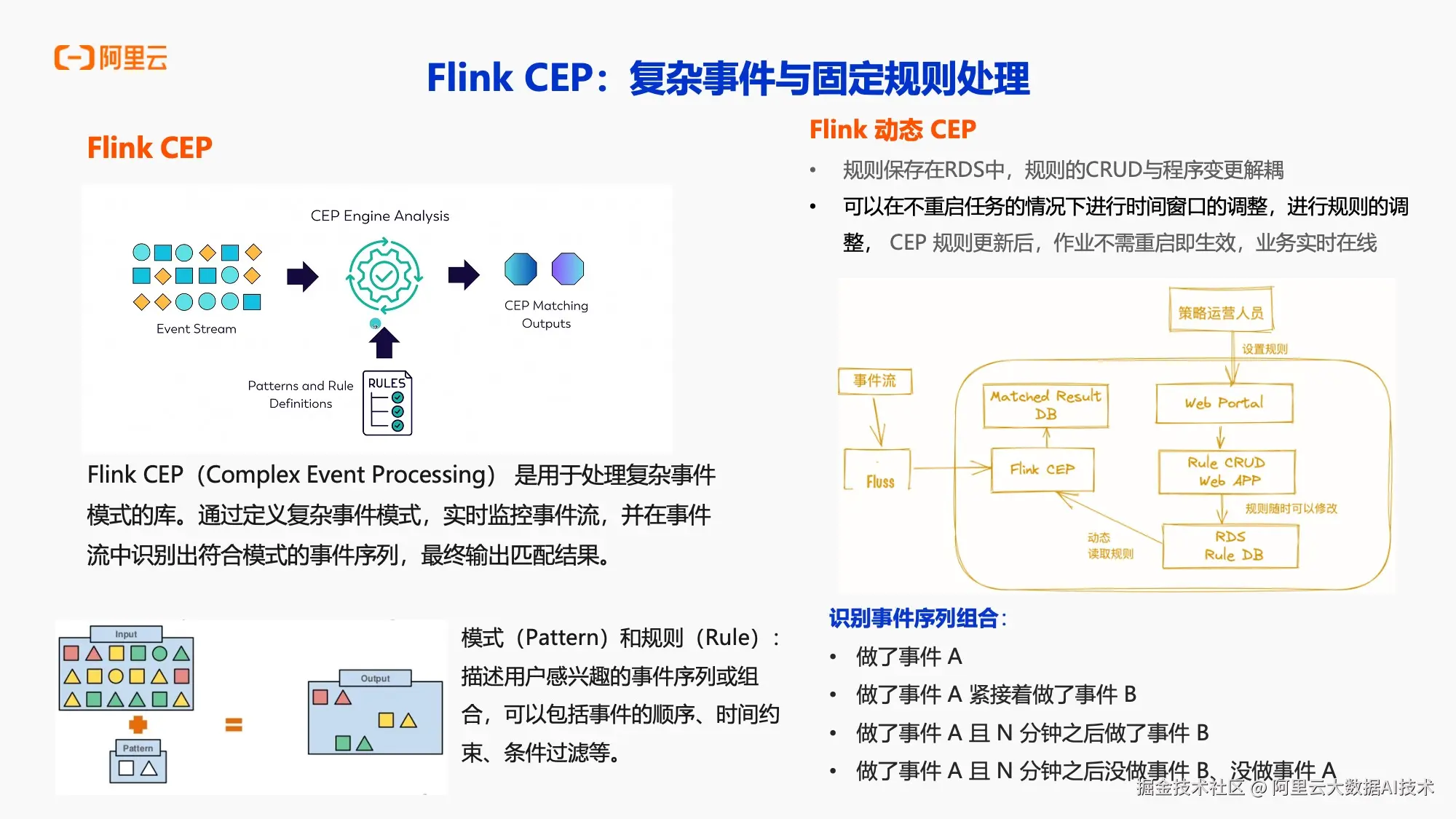 大模型推理与Flink CEP规则互补:Flink AI Function调用LLM负责非结构化数据的语义分析(软规则),Flink CEP负责结构化数据的精确匹配(硬规则),两者结合形成"刚柔并济"的风控策略。