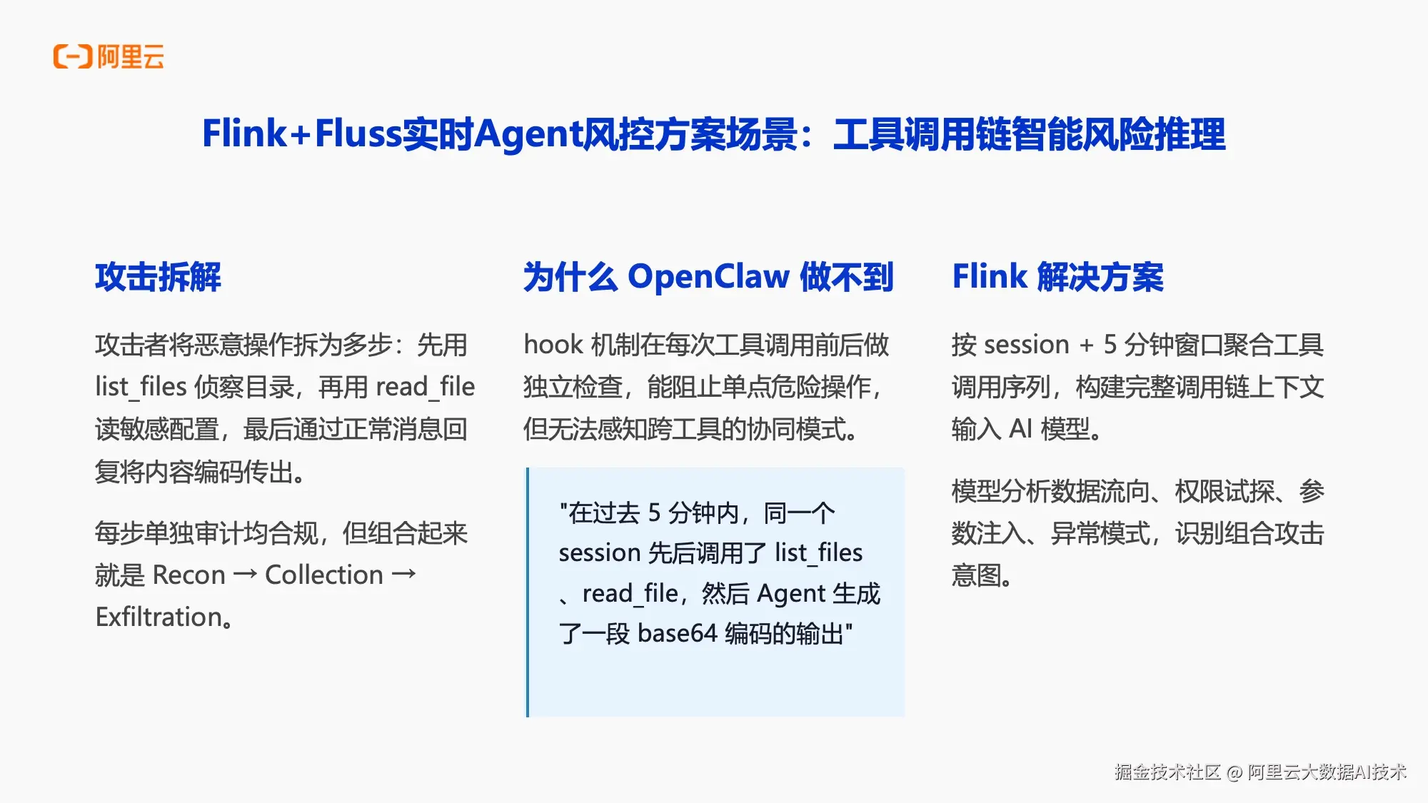 2026年,AI Agent在企业核心业务中的规模化落地引发严峻的安全挑战。传统基于Flink CEP硬编码规则的实时风控方案仅适用于结构化数据和已知风险枚举,无法应对Agent产生的工具调用链、LLM输入输出、Hook事件等非结构化数据,以及动态、开放域的攻击模式。本文提出一套基于Flink + Fluss + 大模型的实时风控架构:通过OpenClaw的Fluss-hook插件在14个生命周期节点无侵入采集全链路事件,经Fluss流式存储写入后,由Flink调用大模型进行语义级风险推理,实现恶意用户识别、工具结果投毒检测、工具调用链风险推理三大场景的秒级告警。该方案将风控逻辑从"预设规则被动匹配"升级为"大模型主动理解",同时保留Flink CEP作为确定性兜底规则引擎,形成"刚柔并济"的风控策略。