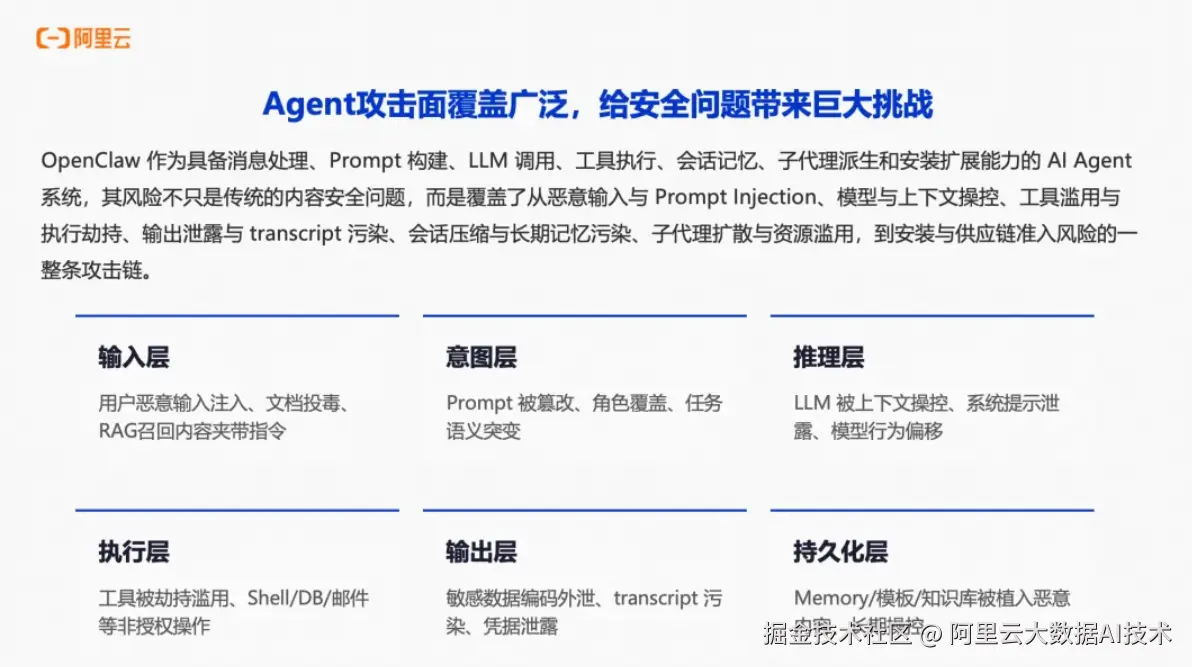 事实上,Agent 在整个生命周期中存在大量潜在风险点------从意图分析层、推理层,到 Agent 执行层、输出层,每个环节都面临不同程度的安全暴露面。