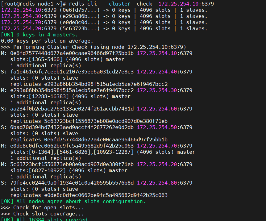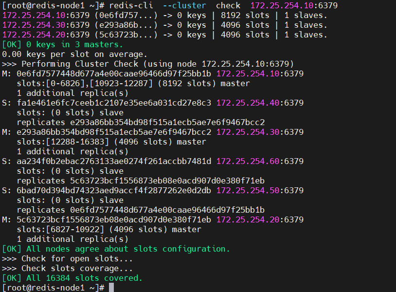 | 检查集群状态 | redis-cli --cluster check <任意节点IP:端口> |