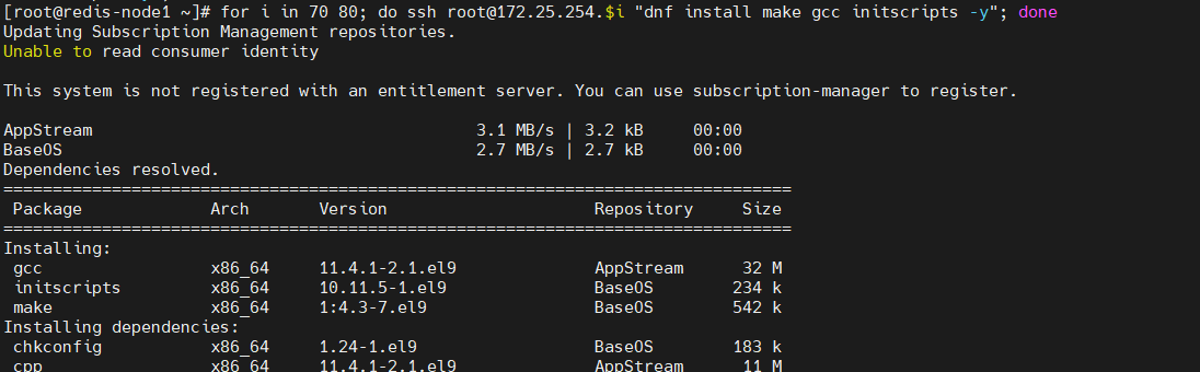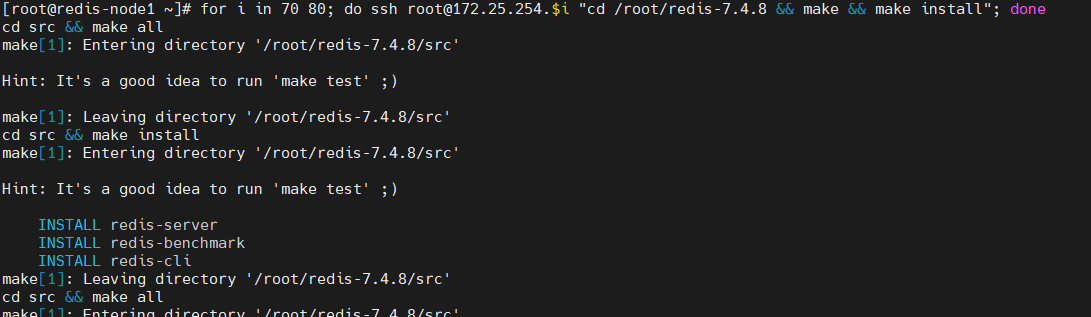 [root@redis-node1 ~]# for i in 70 80; do ssh root@172.25.254.$i "cd /root/redis-7.4.8 && make && make install"; done