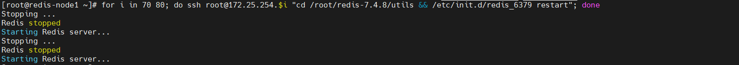 [root@redis-node1 ~]# for i in 70 80; do ssh root@172.25.254.$i "cd /root/redis-7.4.8/utils && /etc/init.d/redis_6379 restart"; done