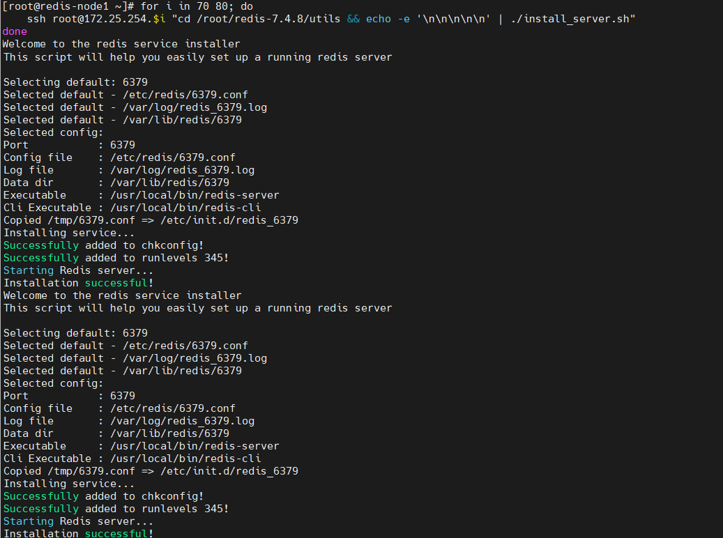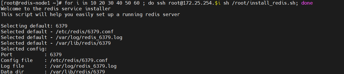 [root@redis-node1 ~]# for i in 10 20 30 40 50 60 ; do ssh root@172.25.254.$i sh /root/install_redis.sh; done
