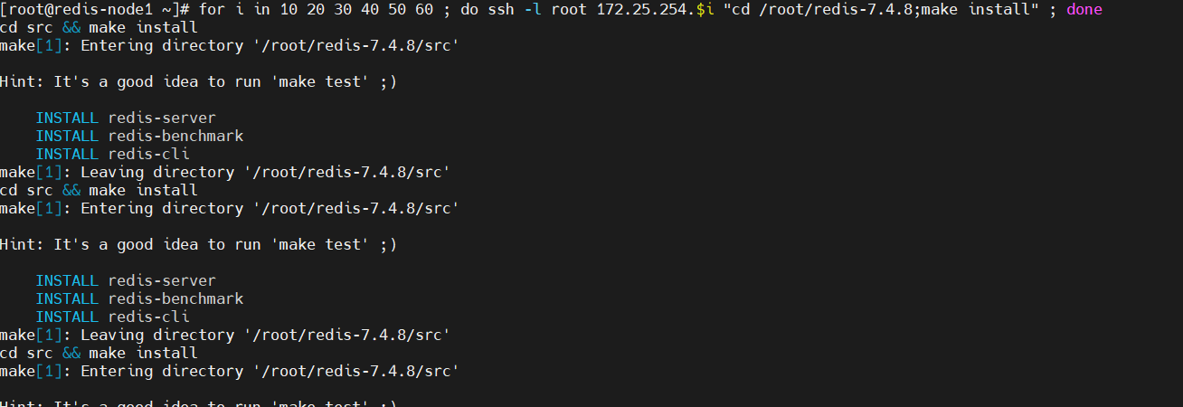 [root@redis-node1 ~]# for i in 10 20 30 40 50 60 ; do ssh -l root 172.25.254.$i "cd /root/redis-7.4.8;make install" ; done