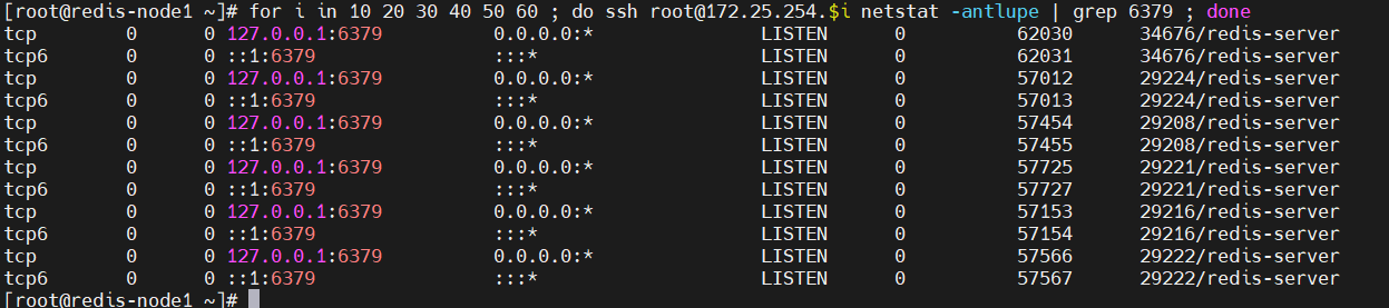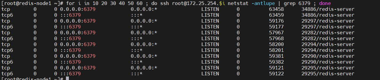 [root@redis-node1 ~]# for i in 10 20 30 40 50 60 ; do ssh root@172.25.254.$i netstat -antlupe | grep 6379 ; done