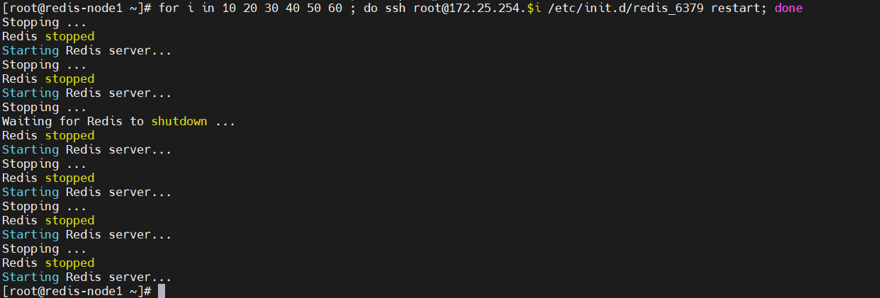 [root@redis-node1 ~]# for i in 10 20 30 40 50 60 ; do ssh root@172.25.254.$i /etc/init.d/redis_6379 restart; done