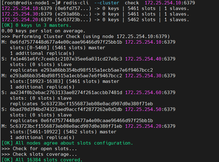 172.25.254.10:6379 (0e6fd757...) -> 0 keys | 5461 slots | 1 slaves.