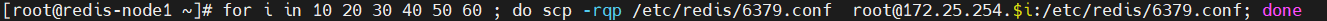 [root@redis-node1 ~]# for i in 10 20 30 40 50 60 ; do scp -rqp /etc/redis/6379.conf root@172.25.254.$i:/etc/redis/6379.conf; done