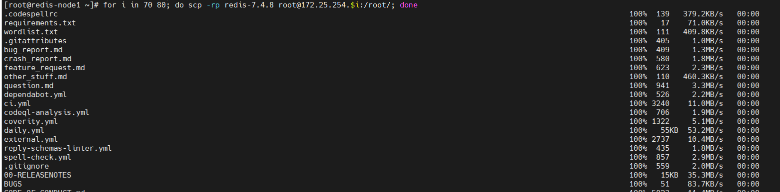 [root@redis-node1 ~]# for i in 10 20 30 40 50 60 ; do scp -rqp redis-7.4.8 root@172.25.254.$i:/root ; done