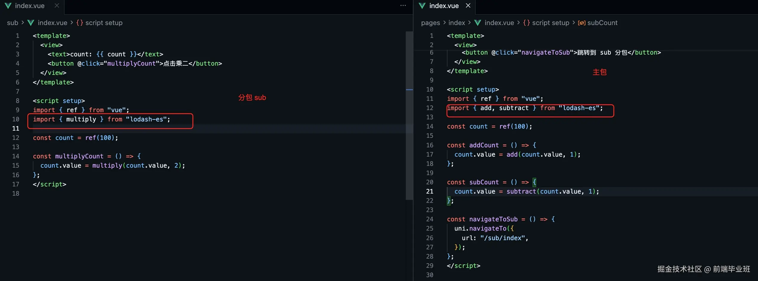 我们举一个简单的例子,主包用到了 lodash-es 的 add 和 subtract 函数,分包 sub 用到了 lodash-es 的 multiply 函数,这种分包用到的内容主包没用,就可以考虑使用这种策略,把 分包 sub 用到的 lodash-es 的 multiply 函数打包到 分包 sub 下,我们来看下 5.04 版本之前的效果