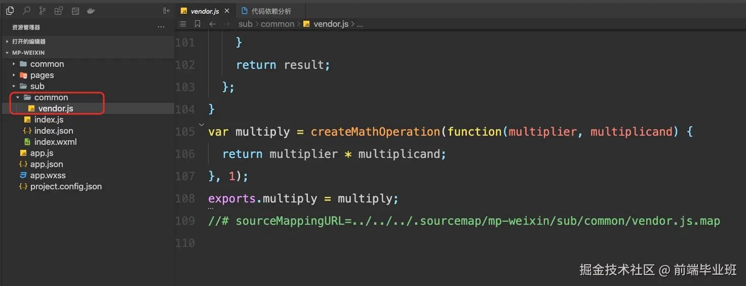 可以看到 分包 sub 根目录下面多了 vendor.js 文件,里面就是 lodash-es 的 multiply 函数