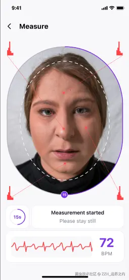 测量过程中,代码要从额头、脸颊这些区域里取颜色变化,再整理成红绿蓝三路信号,页面上还会显示实时波形和实时BPM,如图所示: