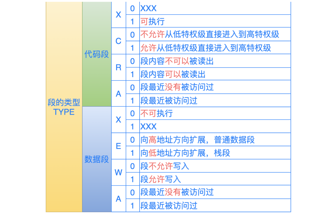 S:指定描述符的类型,S=0则表示为一个系统段,S=1则表示一个代码段或数据段