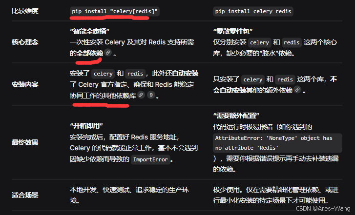 这是 pip 提供的一个"可选依赖"安装方式。这里的 [redis] 被称为"extra",它告诉 pip,在安装 Celery 主程序外,还需要安装专门为 Redis 准备的一组附加的 Python 库。