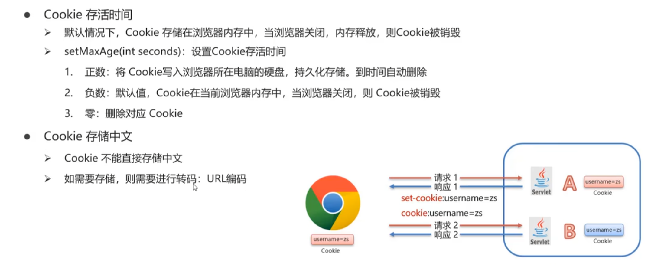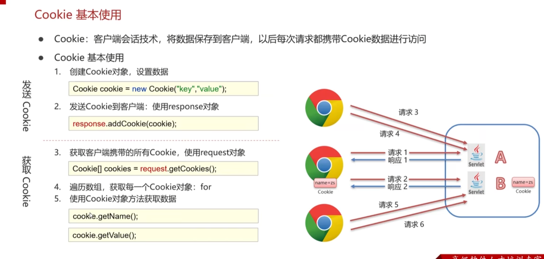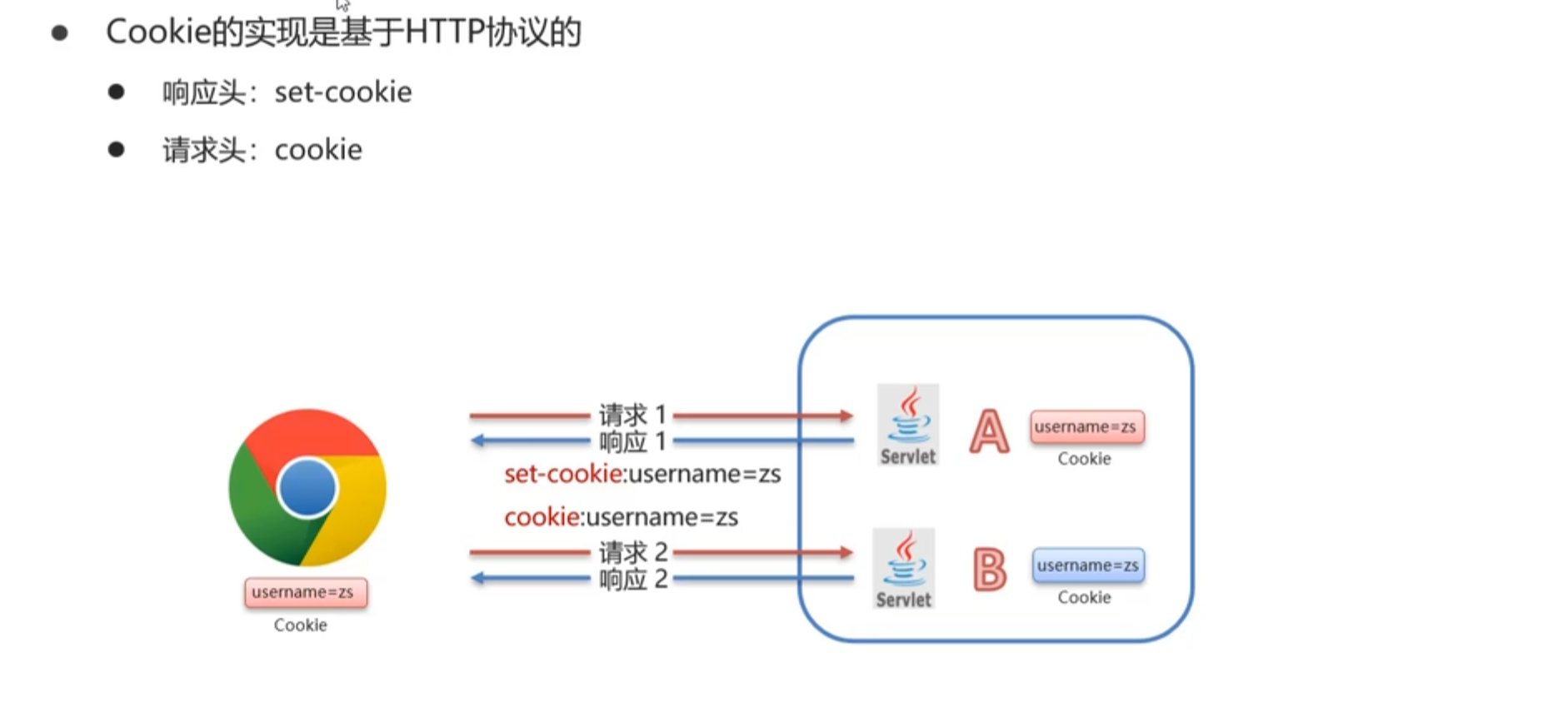 如果是中间的那个浏览器访问服务器资源A,那这时资源A里就创建了一个cookie对象的数据,并且在响应的时候将这个数据返回给浏览器,浏览器在下一次请求的时候就会带着这个cookie的数据