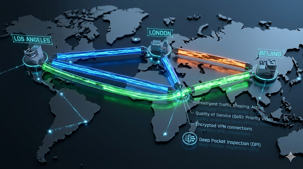 如果伦敦到洛杉矶的公网光纤遭遇局部拥塞导致延迟飙升,QuWAN 的底层探测探针会在几十毫秒内捕捉到这一物理变动。路由引擎会立刻将特效素材的数据流,平滑地重定向至延迟更低的"伦敦-北京-洛杉矶"接力路径中,确保 TCP 连接不断开。