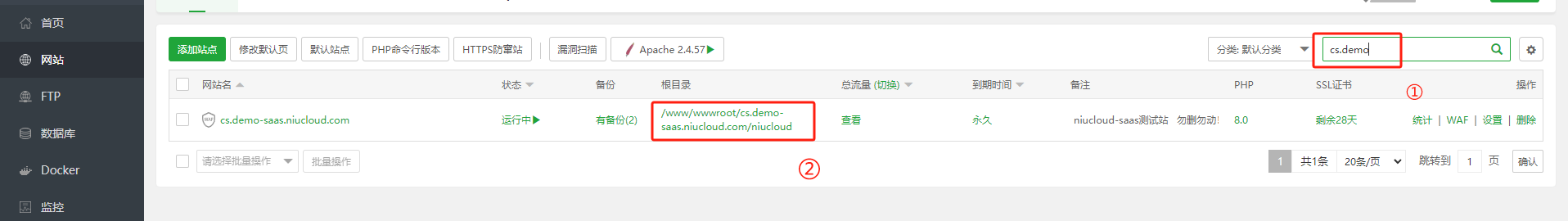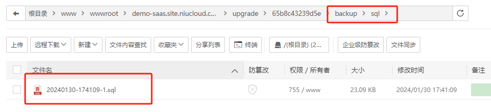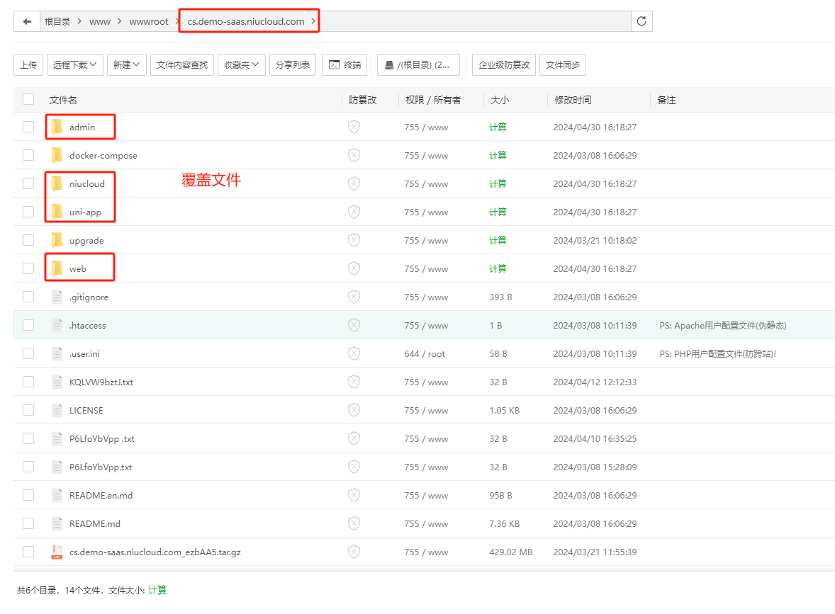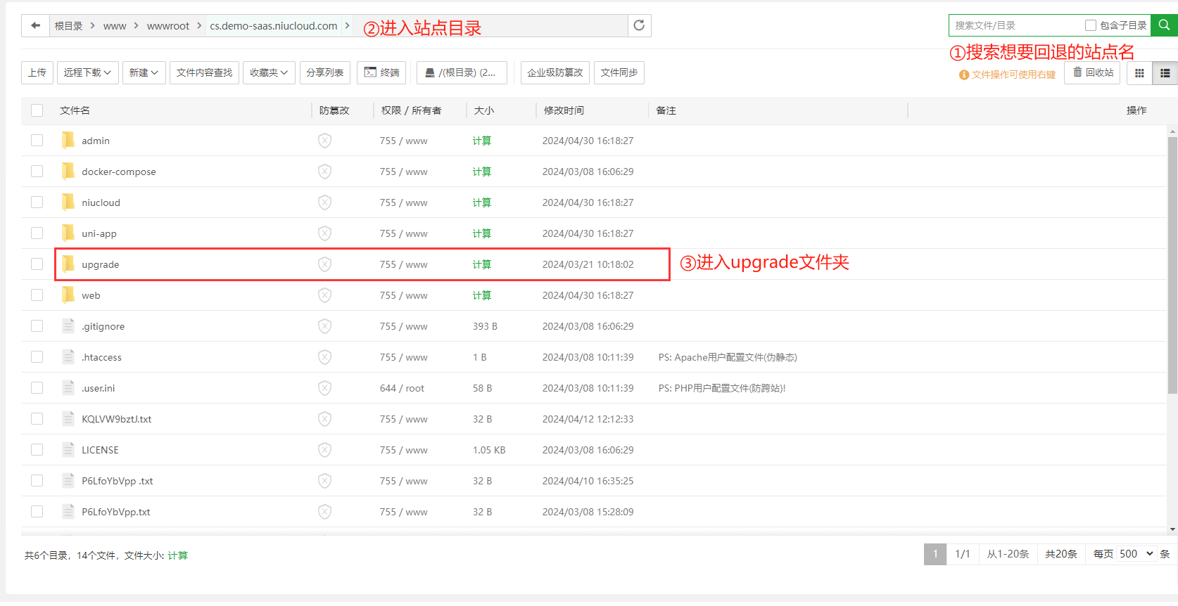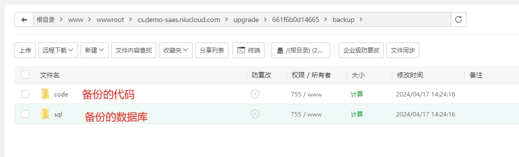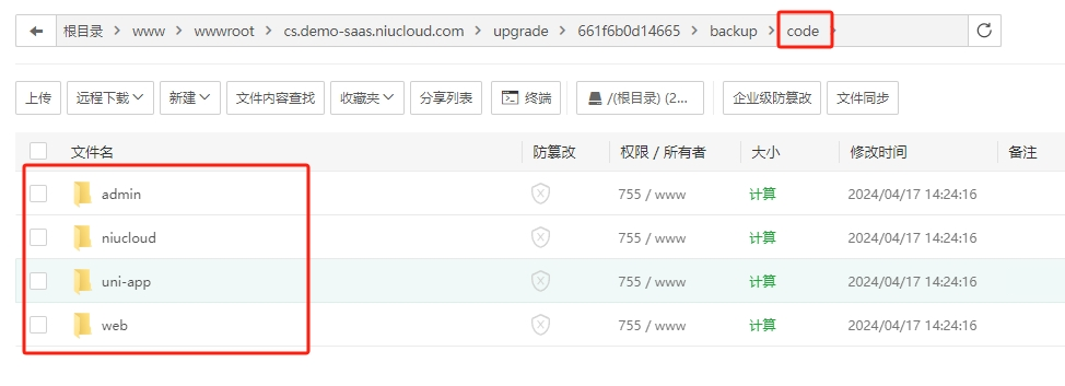 注意:配置好的站点根目录为:站点名/niucloud,需要回退一级目录,到域名所在根目录下找upgrade文件夹
