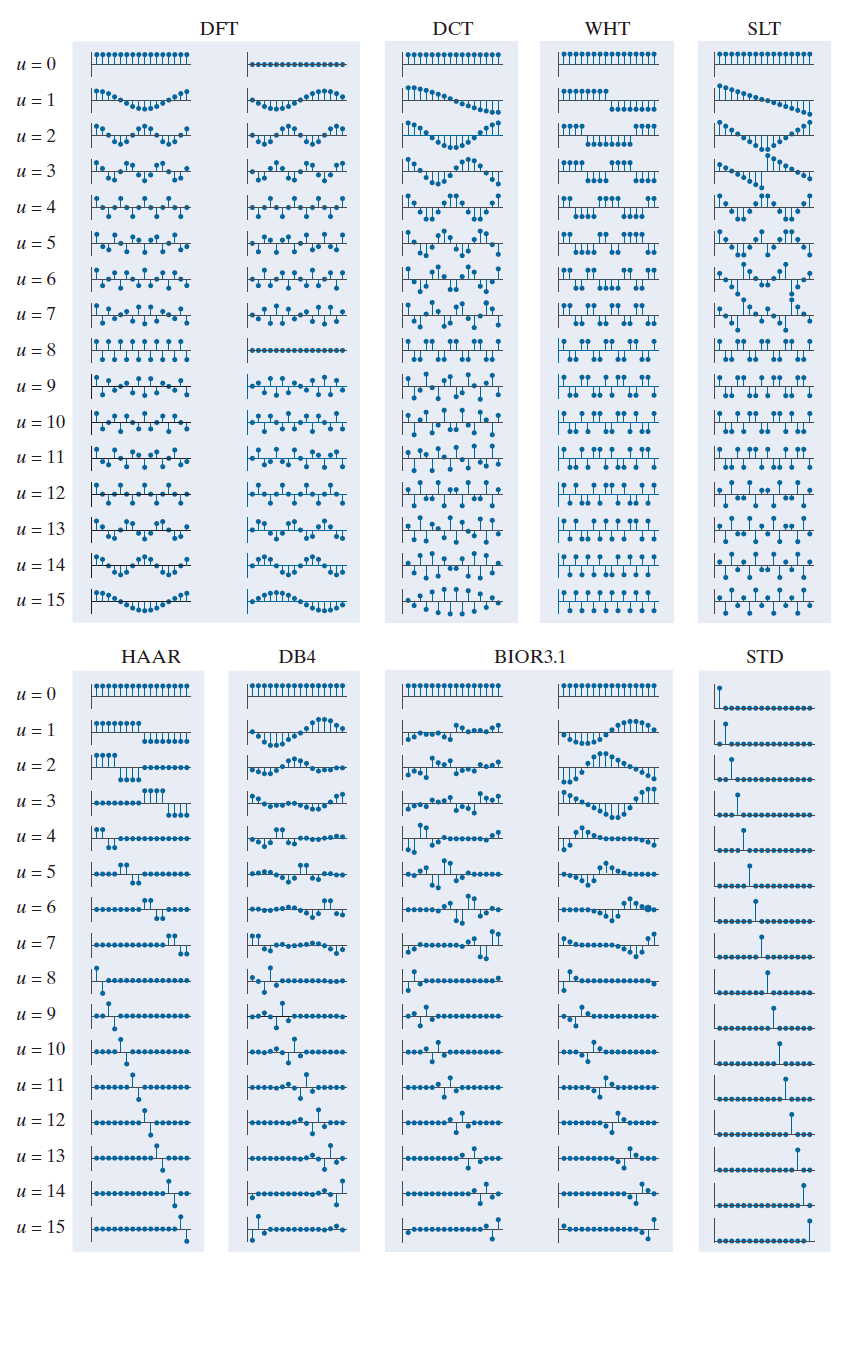 基向量的列率分别为 0,7,3,4,1,6,2 和 5 。这种列率的排列方式是Hadamard排序 Walsh-Hadamard 变换的定义特征。