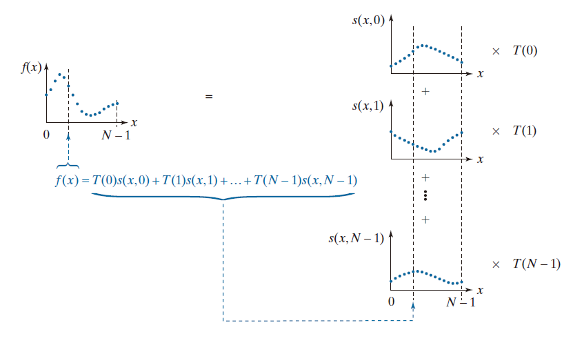 其中,s (x ,u ) 是一个逆变换核,且 x 取得范围 0 ,1 ,2 ,... ,N -- 1 中的值。公式**(7-16)** 中的变换核 r (x ,u ) 和公式 (7-17) 中的变换核 s (x ,u ) (其仅取决于索引x 和u ,而非取决于 f (x ) 和T (u )) 确定了它们定义的变换对的特征( nature**)** 和用途( usefulness**)** 。 公式 (7-17) 如图 7.1 所示。注意,f (x ) 是 N 个逆核函数(即 s (x ,u ), u = 0, 1, ... , N - 1)之加权和,而 T (u )(其中 u = 0, 1, ... , N -- 1)是权重。所有 N 个 s (x ,u ) 都对 f (x ) 在每一个 x 处的值有贡献。如果我们展开公式 (7-17) 的右侧,则可得到