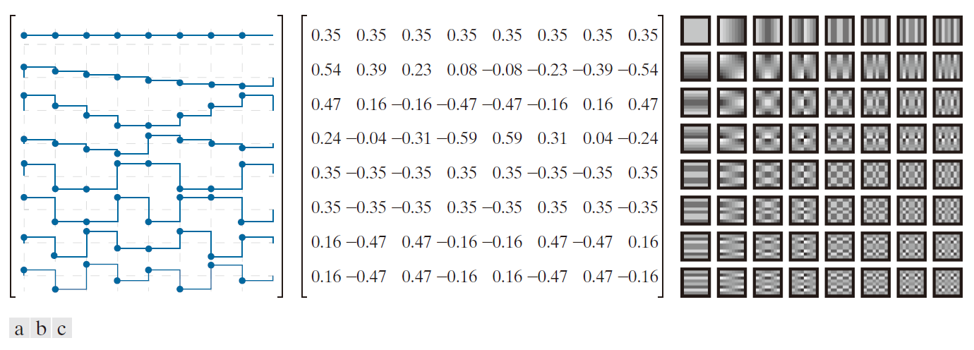 -------------------- ----------图 7.17:N = 8 的斜变换排序的变换变换矩阵和基图像。(a) 正交变换矩阵 的图像表示 ,(b)