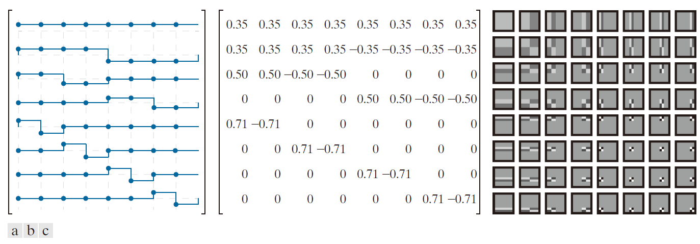 -----------------------------图 7.18:N = 8 时离散 Haar 变换的变换矩阵和基图像。(a) 正交变换矩阵 的图形表示,(b)