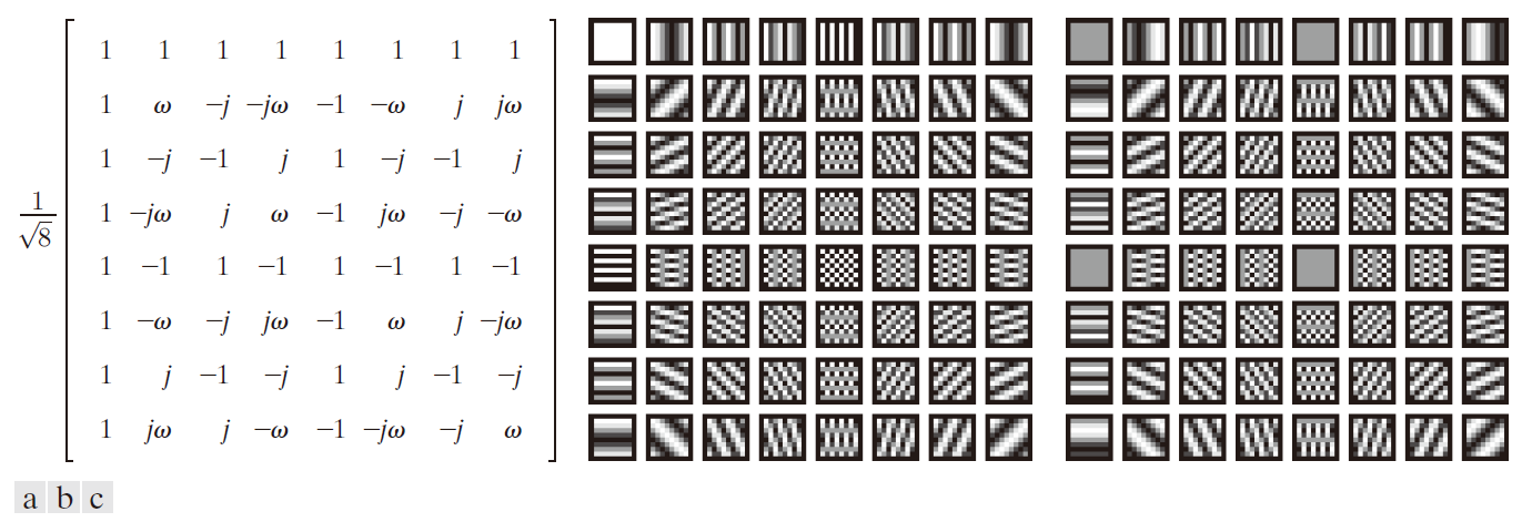 第4章介绍的离散Fourier变换属于一类重要的线性变换 ,包括 Hartley 变换、正弦变换、余弦变换、 Walsh - Hadamard 变换、斜变换( Slant ) 、 Haar 变换和小波变换。 这些变换是本章的主题,它们将函数分解为正交基或双正交基函数之加权和,并且可以使用线性代数和泛函分析的工具进行研究。从这个角度来看,图像是所有图像构成的向量空间中的向量。基函数决定了图像变换的性质和用途 。变换是线性展开式的系数 。对于给定的图像和变换(或一组基函数),基函数的正交性和所得变换的系数都可以使用内积来计算。所有图像变换在某种意义上都是等价的,因为它们包含相同的信息和总能量。它们是可逆的,区别仅在于信息和能量在变换系数中的分布方式不同。