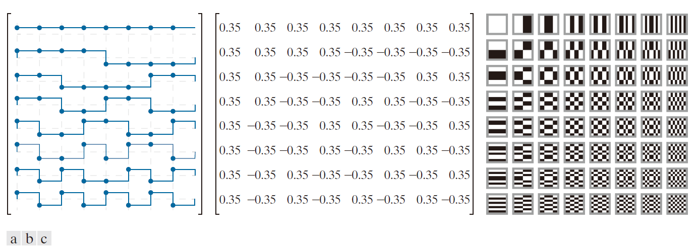 ------------------------------图 7.16:N = 8 的列率排序Walsh-Hadamard的变换变换矩阵和基图像。(a) 正交变换矩阵 的图形表示,(b)