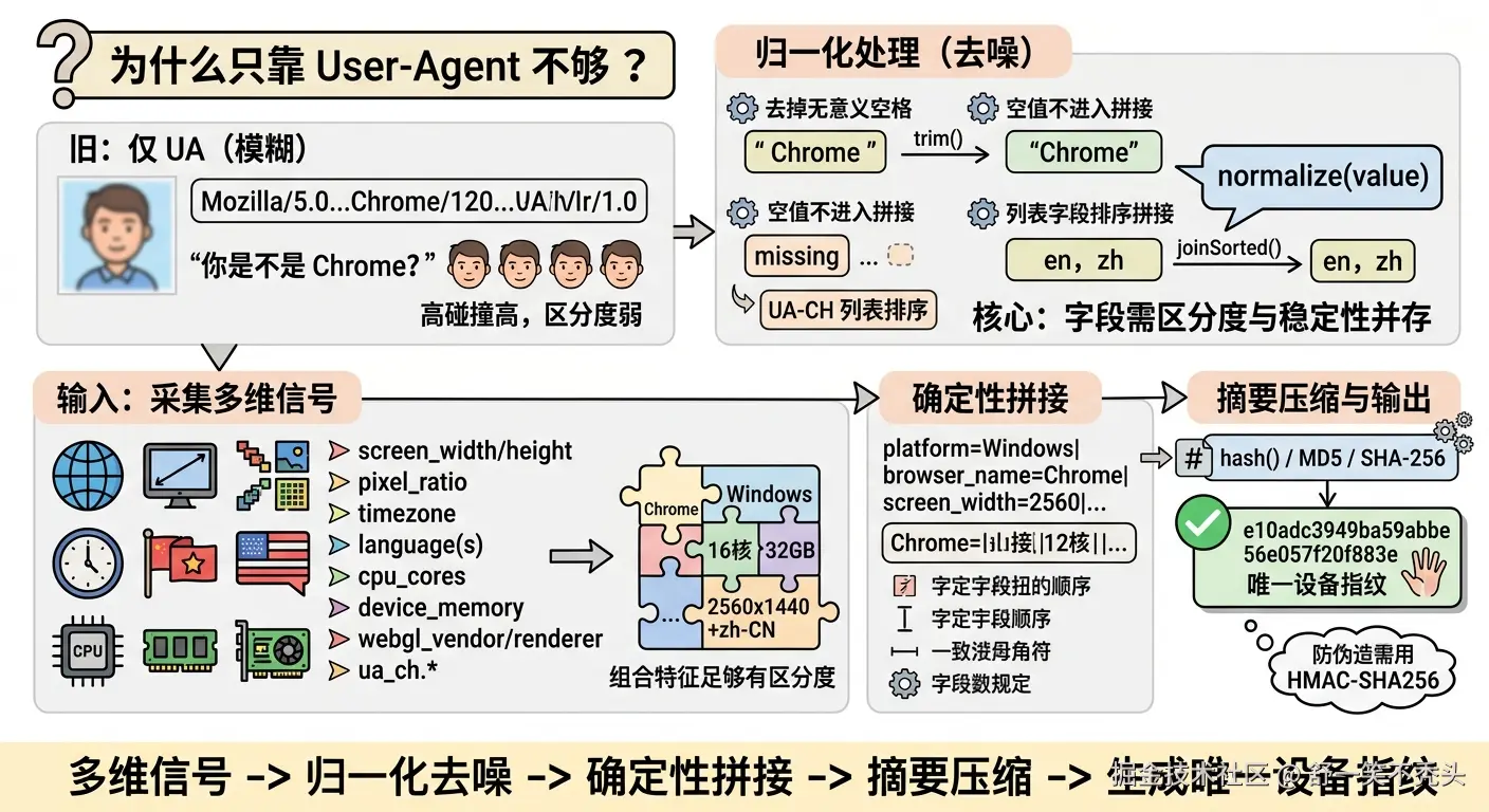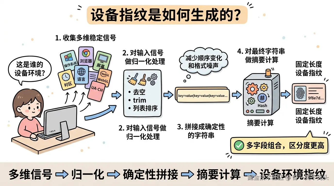 设备指纹真正有价值的地方,不是最后用了什么摘要算法,而是前面收集了足够多的信号。