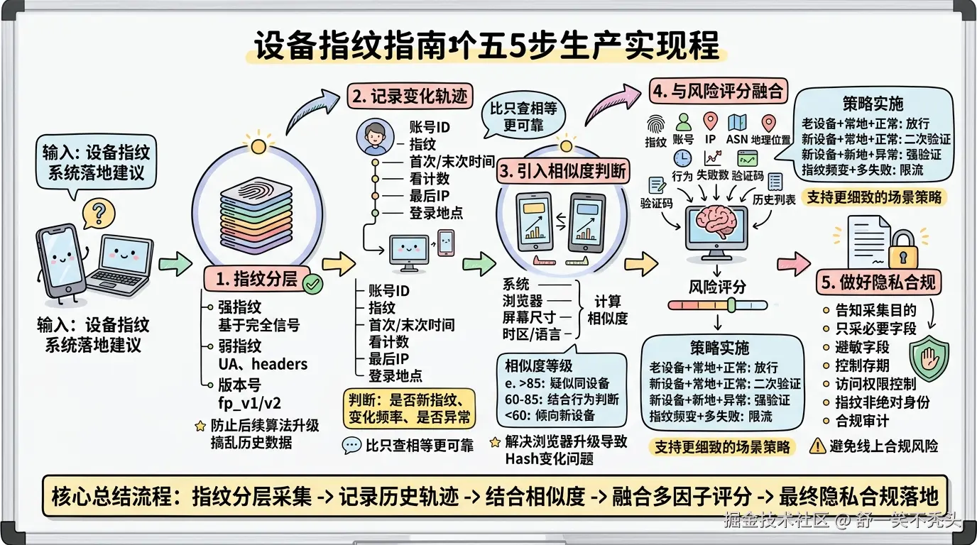 最终使用摘要算法生成固定长度指纹,用于设备识别、登录保护和风险判断。